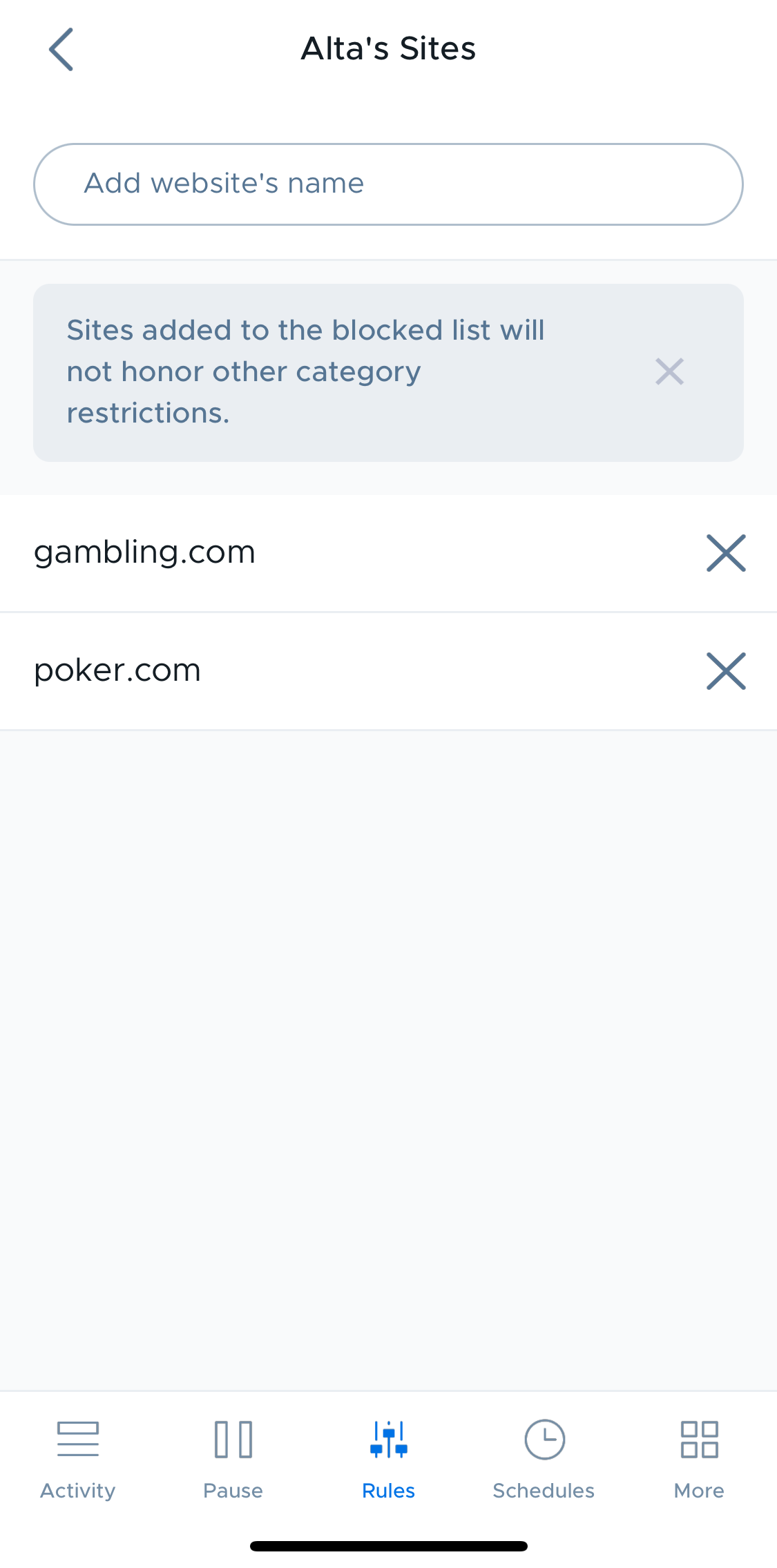 تتيح لك قائمة ”المواقع“ إدخال مواقع ويب محددة لحظرها. يمكن إزالة المواقع بالنقر على أيقونة X الموجودة على اليمين.