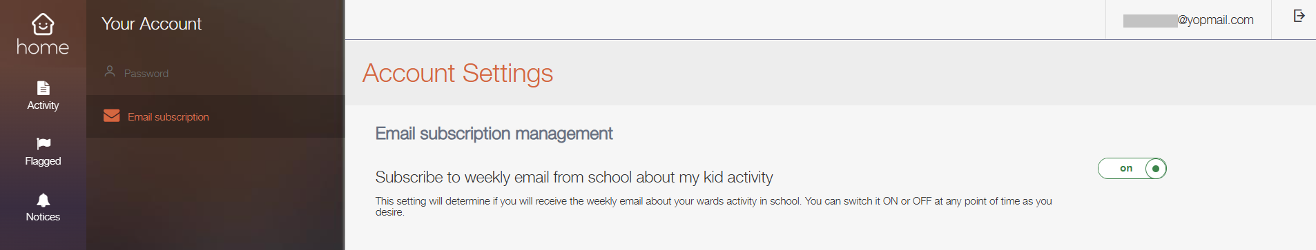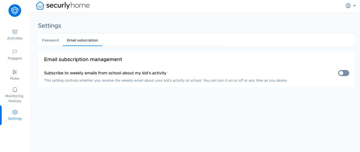 Log in to the Securly Home Parent portal and navigate to Settings > Email subscription and use the toggle button to unsubscribe from weekly emails.