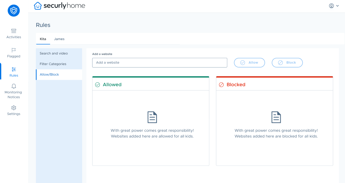 Please note that if a site is not specifically listed in either the Allowed or Blocked lists, it is filtered as per the filtering policy configured by the school or you if that website is present in the Securly database.