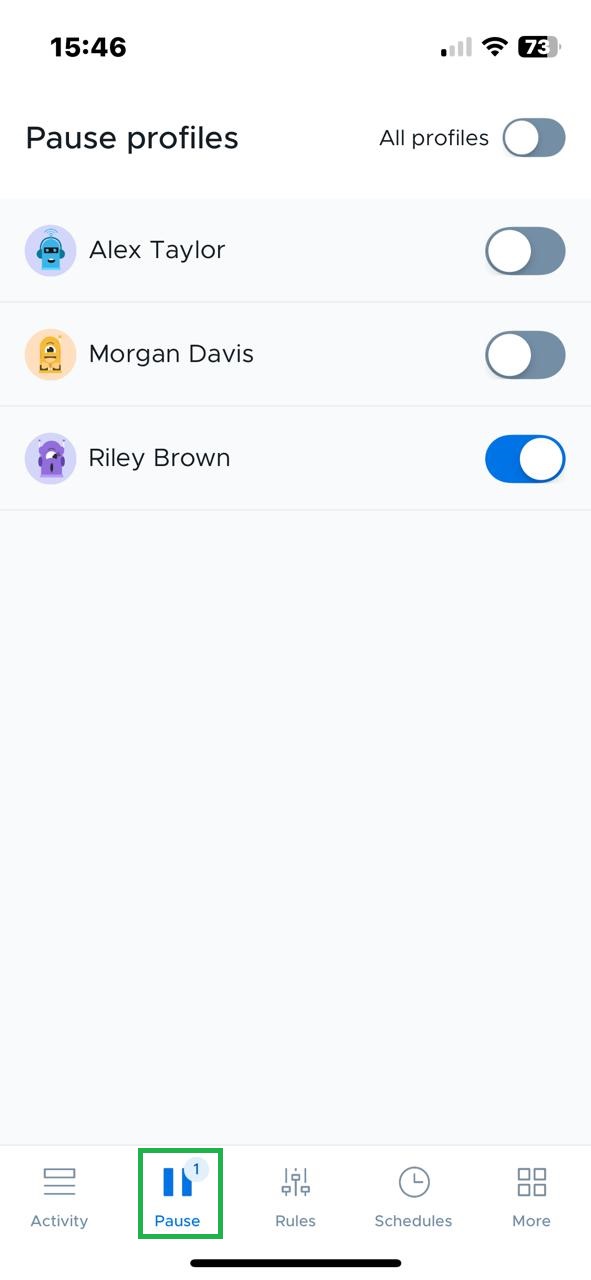 Al tocar la pestaña Pausar, aparecerá una lista de niños. Para pausar o reanudar la conexión a Internet del dispositivo de un niño, simplemente toque el botón de pausa junto al nombre del niño.