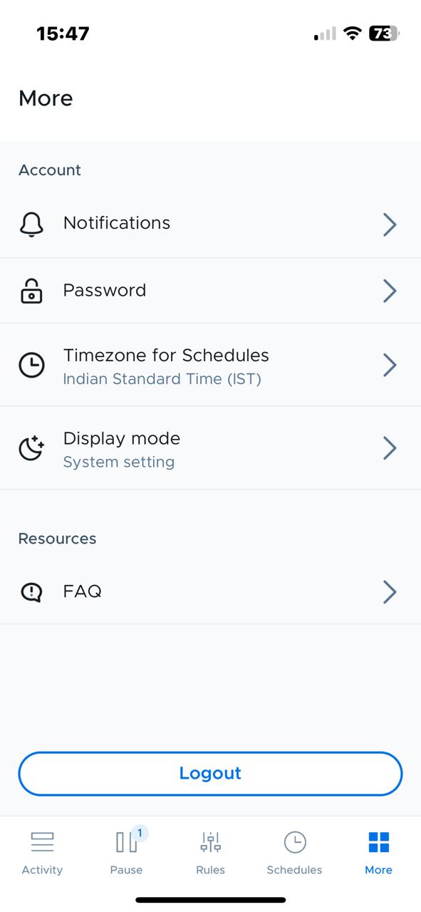 थप ट्याबमा खाता सेटिङहरू र FAQs छन्। लग आउट गर्ने विकल्प पनि छ।