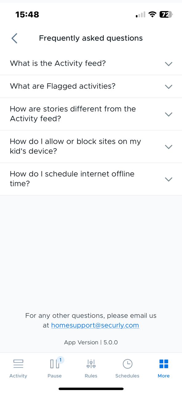 د FAQ برخه تاسو ته اجازه درکوي چې د سیکورلي هوم ایپ په اړه د ډیری پوښتل شویو پوښتنو ځوابونه وګورئ. والدین کولی شي د سکرین په ښکته کې د بریښنالیک لینک په ټایپ کولو سره د سیکورلي هوم ملاتړ سره هم اړیکه ونیسي.